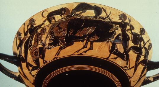 Then he trapped the boar in a net, and carried it all the way to Mycenae. Eurystheus, again amazed and frightened by the hero's powers, hid in his partly buried bronze jar.