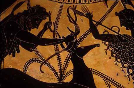 First, Hercules lured the coily creature from the safety of its den by shooting flaming arrows at it. Once the hydra emerged, Hercules seized it. The monster was not so easily overcome, though, for it wound one of its coils around Hercules' foot and made it impossible for the hero to escape. With his club, Hercules attacked the many heads of the hydra, but as soon as he smashed one head, two more would burst forth in its place! To make matters worse, the hydra had a friend of its own: a huge crab began biting the trapped foot of Hercules. Quickly disposing of this nuisance, most likely with a swift bash of his club, Hercules called on Iolaus to help him out of this tricky situation.