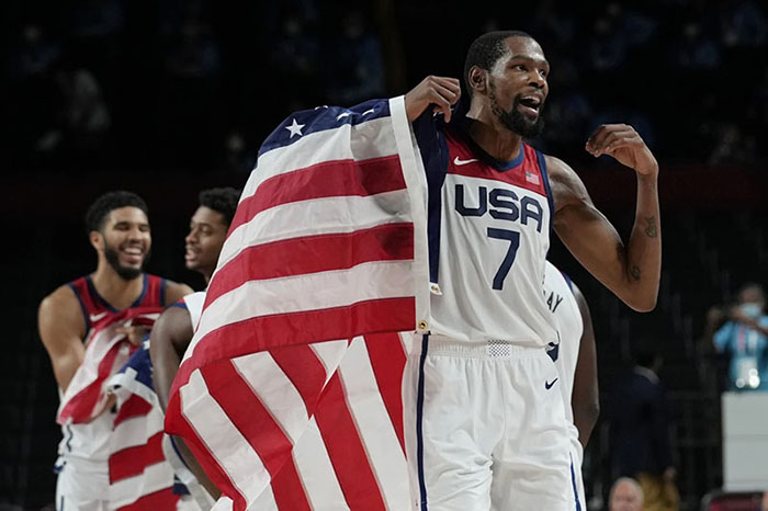 Kevin Durant scored 29 points, leading the United States to an 87-82 victory over France on Saturday, bringing home Olympic gold and re-establishing America's status as the world's pre-eminent basketball power. The triumph capped a tumultuous month, in which America's position as hoops kingpins was seriously questioned.