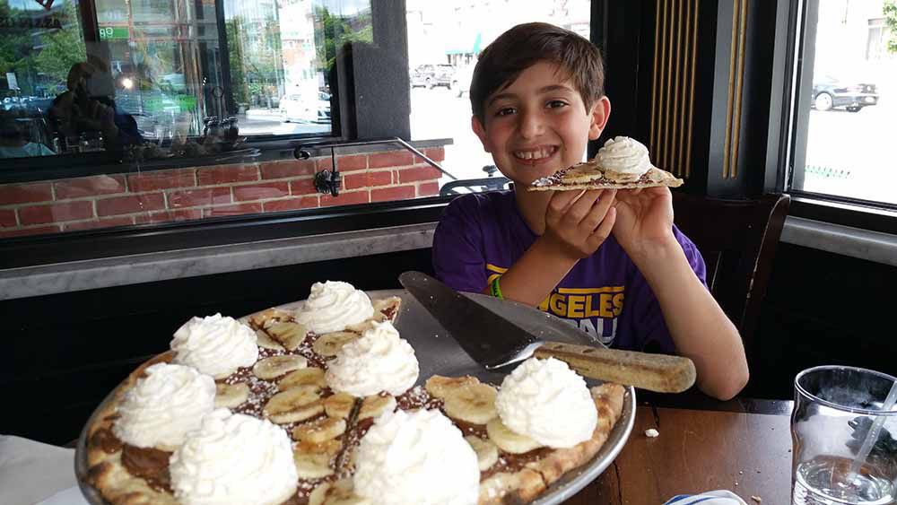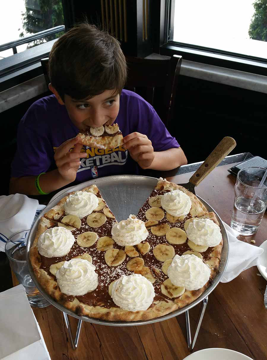 Thin crust pizza topped with nutella, banana slices, whipped cream, powdered sugar and cinnamon.