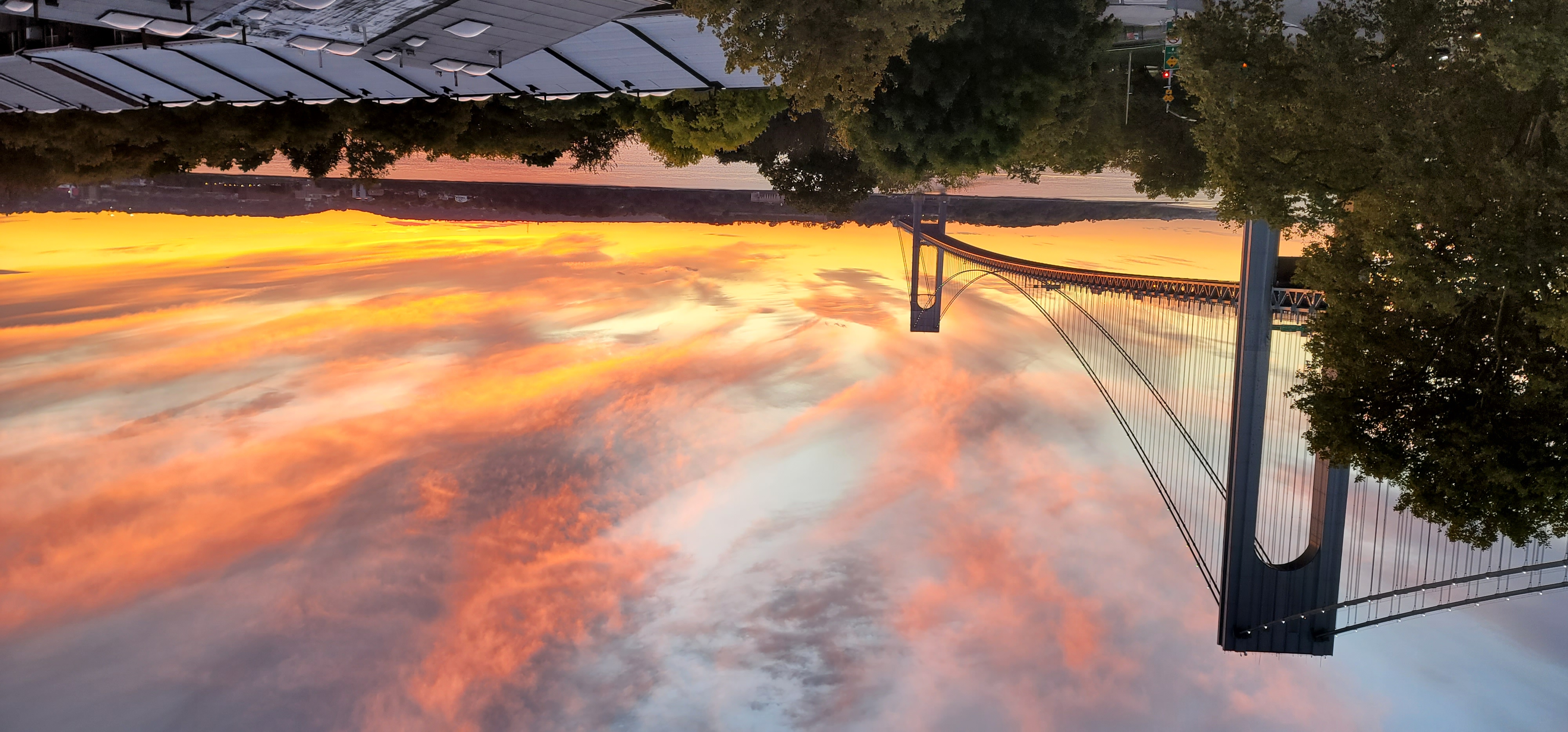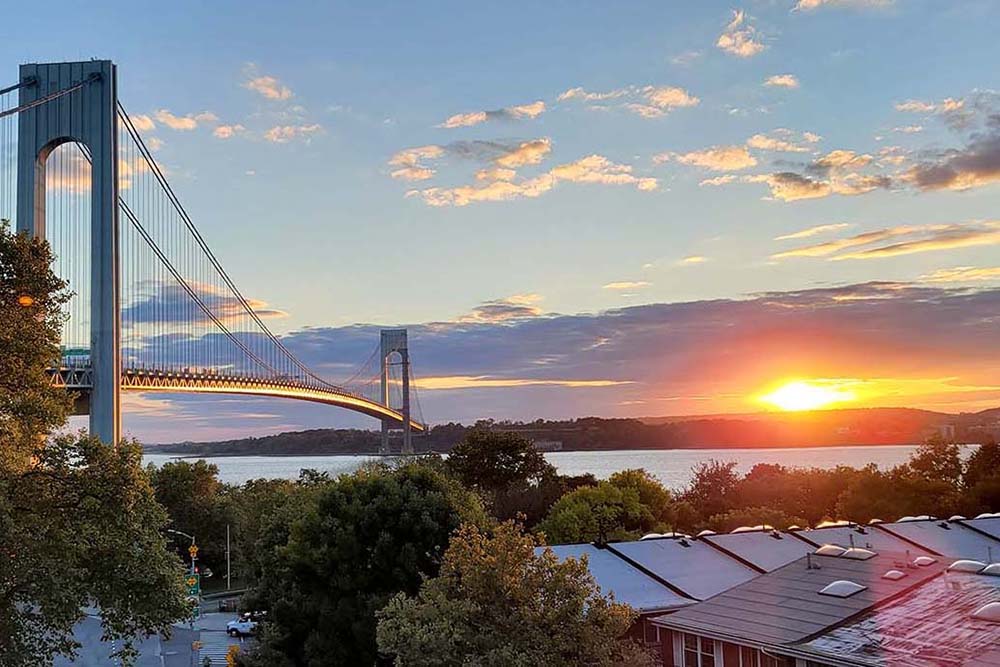 Tuesday Sunset - As the sun set it created a stunning sunlit arch on the Verrazano Bridge. On the lower right we see rays of sunlight over the rooftops. An orange reflection is seen on the tree on the top left. A lenticular cloud floats over the bridge reminding me of a UFO - a flying saucer. It's about the "plates".