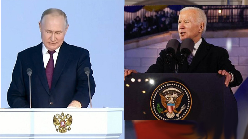 Split-screen - Putin giving his equivalent of the state of the union address while Biden gives a major speech from Warsaw about the need for democracies to stand together for as long as it takes.