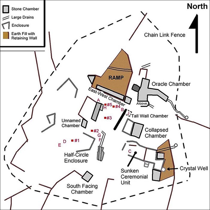 Other impressive constructions on the site include a number of underground chambers with clear astronomical alignments including; a "south facing" chamber made of large quarried rock and covered by several multi-ton lintel slabs; a classic V-hut chamber, above ground, wedge shaped and adjacent to a large basin cut into the bedrock which was a starting point for a network of sophisticated drains that extends to the east. This chamber is oriented to the southwest like many similar European Neolithic structures and bears a striking resemblance to those found like it in the British Isles. The East-West chamber, a three sectioned chamber also made with massive roof lintels and entry stones of several tons is on site as well. This chamber, like others in Europe, is located on an old fault line some say because of the discernible magnetic phenomenon that occur near geological sites of this kind.