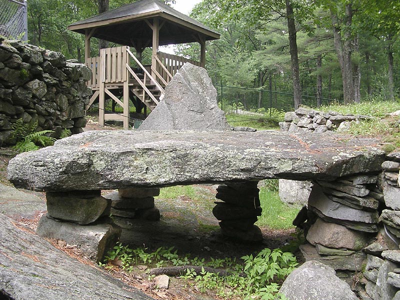 Megalithic constructions known as dolmens can be found all across new England, the western part of Europe and even into Syria and South Africa. Dolmen comes from the Breton word for stone table as the dolmens in many instances are three, four or five smaller boulders topped by an immense, flat-topped boulder than can weigh any where from several tons to 90 tons. Many of these capstones are however roundish, dressed stones, and not flat topped.