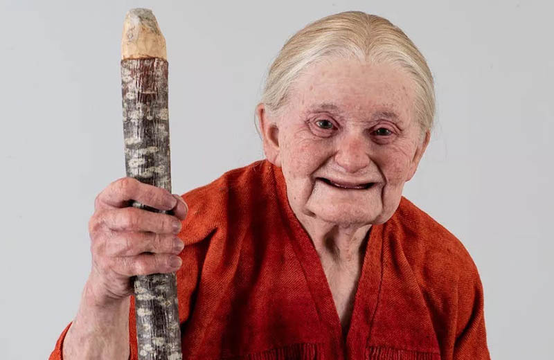 A life-size 3D model of a grinning old woman holding a walking stick looks like a contemporary elder on a stroll through her neighborhood. In reality, this woman lived nearly 800 years ago in Norway, and the model is a sculpted life-sized reconstruction based on her skeleton.