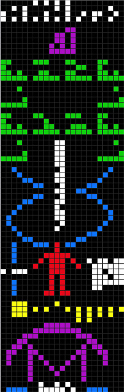 The message was broadcast into space a single time via frequency modulated radio waves at a ceremony to mark the remodeling of the Arecibo radio telescope in Puerto Rico on 16 November 1974. The message was aimed at the current location of M13, about 25,000 light years from Earth, because M13 was a large and relatively close collection of stars that was available in the sky at the time and place of the ceremony. When correctly translated into graphics, characters, and spaces, the 1,679 bits of data contained within the message form the image shown here. Read more