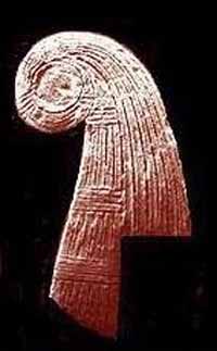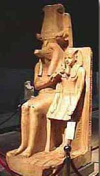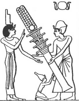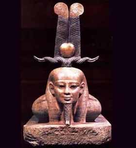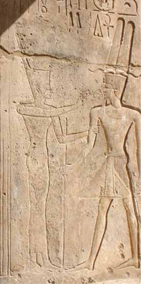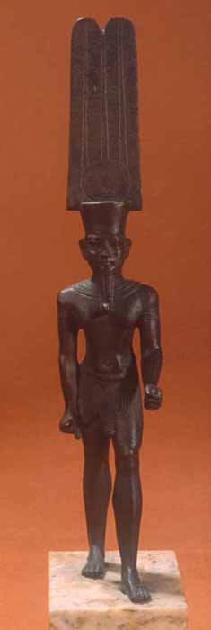 Atef is the specific feathered white crown of the Egyptian Deity Osiris. It combines the Hedjet, the crown of Upper Egypt, with red ostrich feathers for the Osiris cult. The feathers are identified as ostrich from their curl or curve at the upper ends, with a slight flare toward the base. They are the same feather as (singly) worn by Maat. They may be compared with the falcon tail feathers in two-feather crowns, such as those of Amun which are more narrow and straight without curve.