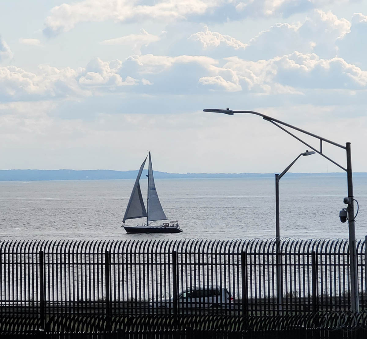 The lamppost on the left faces west (Statue of Liberty and Manhattan).