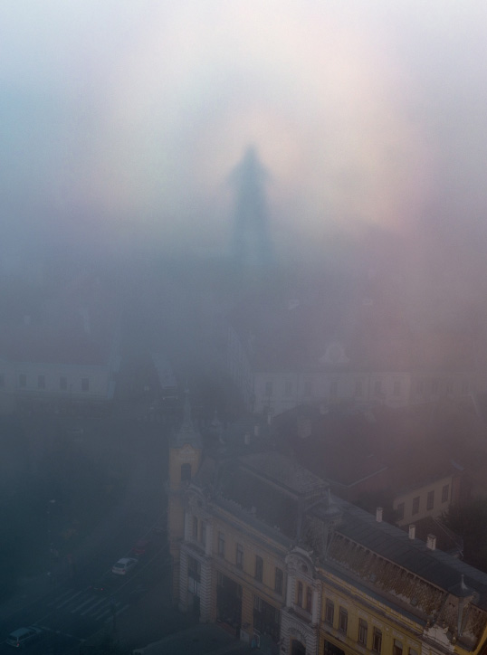 The city of Veszprem, Hungary was only briefly haunted by this mysterious spectre. On the morning of August 11, its monstrous form hovered in the mist above municipal buildings near the town center. A clue to its true identity is offered by the photographer, though, who reports he took the picture from the top of a twenty story building with the rising Sun directly at his back. That special geometry suggests this is an example of an atmospheric phenomenon called the Glory or sometimes "the Spectre of the Brocken". Also seen from mountain tops and airplanes when looking opposite the Sun, the dramatic apparition is the observer's shadow on clouds or fog, the small droplets of water scattering light back towards the Sun through complex internal reflections. Careful night sky watchers can also encounter this spectre's analog in astronomy, a brightening of zodiacal light opposite the Sun known as the gegenschein.