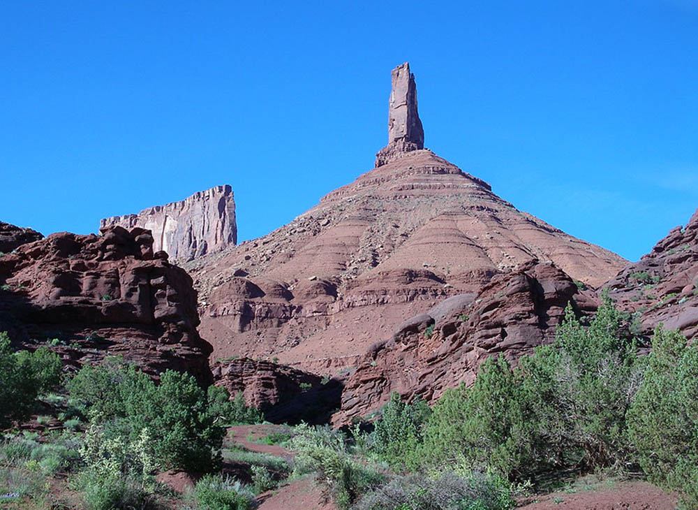 Castle Rock is a 400-foot (120 m) Wingate Sandstone tower standing on a 1,000 foot Moenkopi-Chinle cone above the northeastern border of Castle Valley, Utah. The Tower is world-renowned as a subject for photography and for its classic rock climbing routes, the most famous of which is the Kor-Ingalls Route featured in Fifty Classic Climbs of North America. Castle Rock can be accessed by a trail that begins south of the tower at a primitive camp ground. Castleton Tower sits at the southern terminus of a ridge made mostly of red sand, gravel, scatter boulders, and few short cliff lines. Read more ...