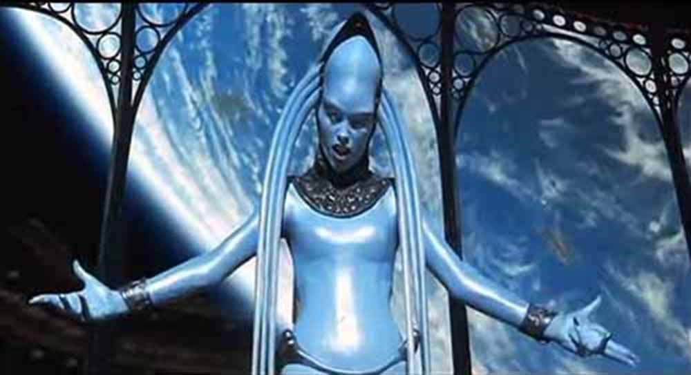 This mannequin reminds me of the Blue Alien or Diva Plavalaguna from "The Fifth Element". She is standing in front of Isis.