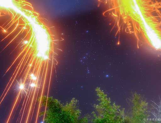 From Spaceweather.com ... The Year of the Rooster is underway. This weekend, more than a billion people celebrated the Chinese New Year. To mark the occasion, the Chinese Astronomy Photographic Alliance took this picture of Orion framed by fireworks ... "When the three Belt stars of Orion shine high in the south after sunset, it's time for the spring festival in China ... the traditional Chinese New Year, starting this weekend!" says Jeff Dai, who forwarded the photo. "The stars of Orion's Belt are regarded as the three gods of fortune, prosperity and longevity by Chinese. It's a lunar new year and so the date is based upon the new moon. This year's festivities kicked off on Jan. 28th and will continue for 15 days, culminating with the Lantern Festival.