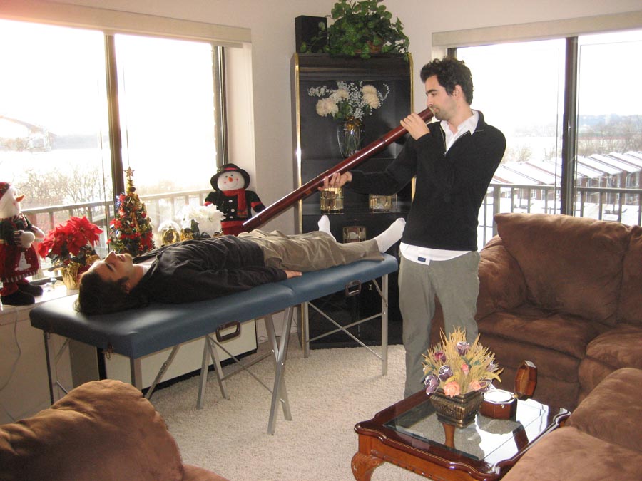 The didgeridoo is played with continuously vibrating lips to produce the drone while using a special breathing technique called circular breathing. This requires breathing in through the nose whilst simultaneously expelling stored air out of the mouth using the tongue and cheeks. By use of this technique, a skilled player can replenish the air in their lungs, and with practice can sustain a note for as long as desired. Recordings exist of modern didgeridoo players playing continuously for more than 40 minutes; Mark Atkins on Didgeridoo Concerto (1994) plays for over 50 minutes continuously.