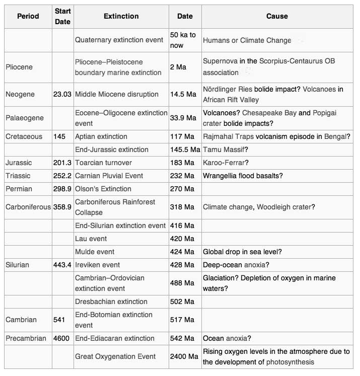 Since life began on Earth, several major mass extinctions have significantly exceeded the background extinction rate. The most recent, the Cretaceous-Paleogene extinction event, which occurred approximately 66 million years ago (Ma), was a large-scale mass extinction of animal and plant species in a geologically short period of time. In the past 540 million years there have been five major events when over 50% of animal species died. Mass extinctions seem to be a Phanerozoic phenomenon, with extinction rates low before large complex organisms arose.