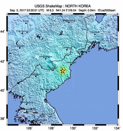 The United States Geological Survey reported an earthquake of 6.3-magnitude not far from North Korea's Punggye-ri nuclear test site. South Korean authorities said the earthquake seemed to be artificial, consistent with a nuclear test. The USGS, as well as China Earthquake Networks Center, reported that the initial event was followed by a second, smaller, earthquake at the site, several minutes later, which was characterized as a collapse of the cavity.