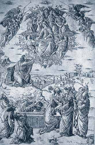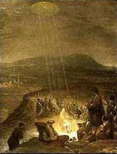Saucer shaped "clouds" intrigue modern ufologists. Could so many have appeared in the sky at one time? Or, are the hat shaped UFOs depicted so numerous here to -punctuate- certain events as being particularly holy?