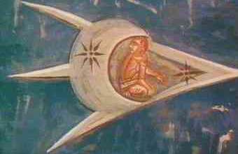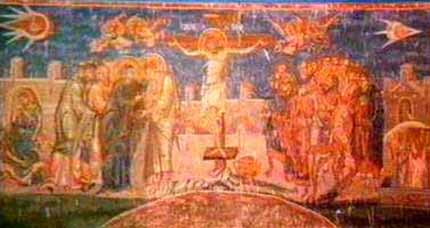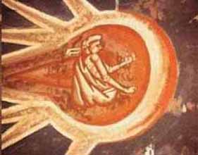 Frescos throughout Europe reveal the appearance of space ships. This 1350 painting seems to depict a small human looking man looking over his shoulder at another flying vehicle. His vehicle is decorated with two twinkling stars, one reminiscent of national insignia on modern aircraft. This painting hangs above the altar at the Visoki Decani Monestary in Kosovo, Yugoslavia.