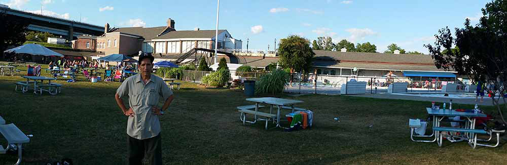 Families were packing up to go home after a day at the pool as a group of children finished a football game (far left). The first picture is William in the outdoor recreation area with the Verrazano Bridge off to the far left in the picture.