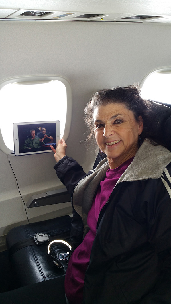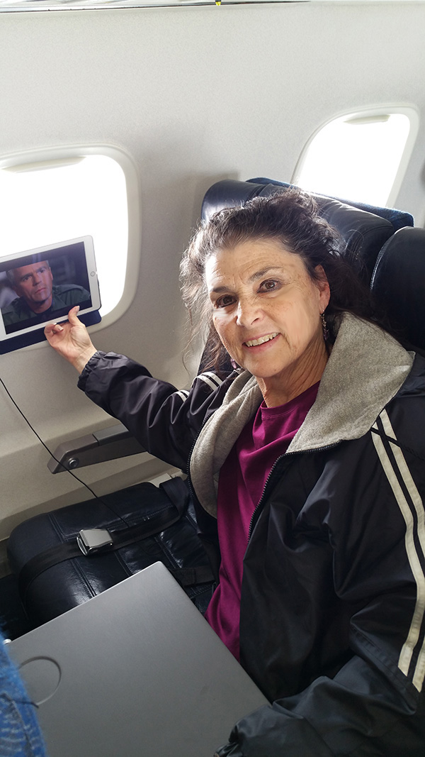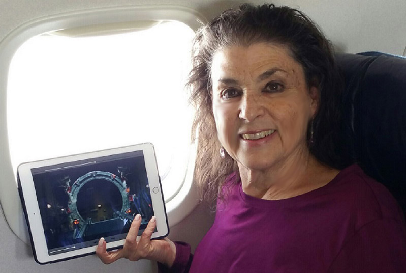 Then I remembered I had "Window of Opportunity" on iTunes and "froze" the scene of the stargate on my iPad. Along came a friendly flight attendant named Isabel, who took a few pics of me with the image. What a trip. I am going home.