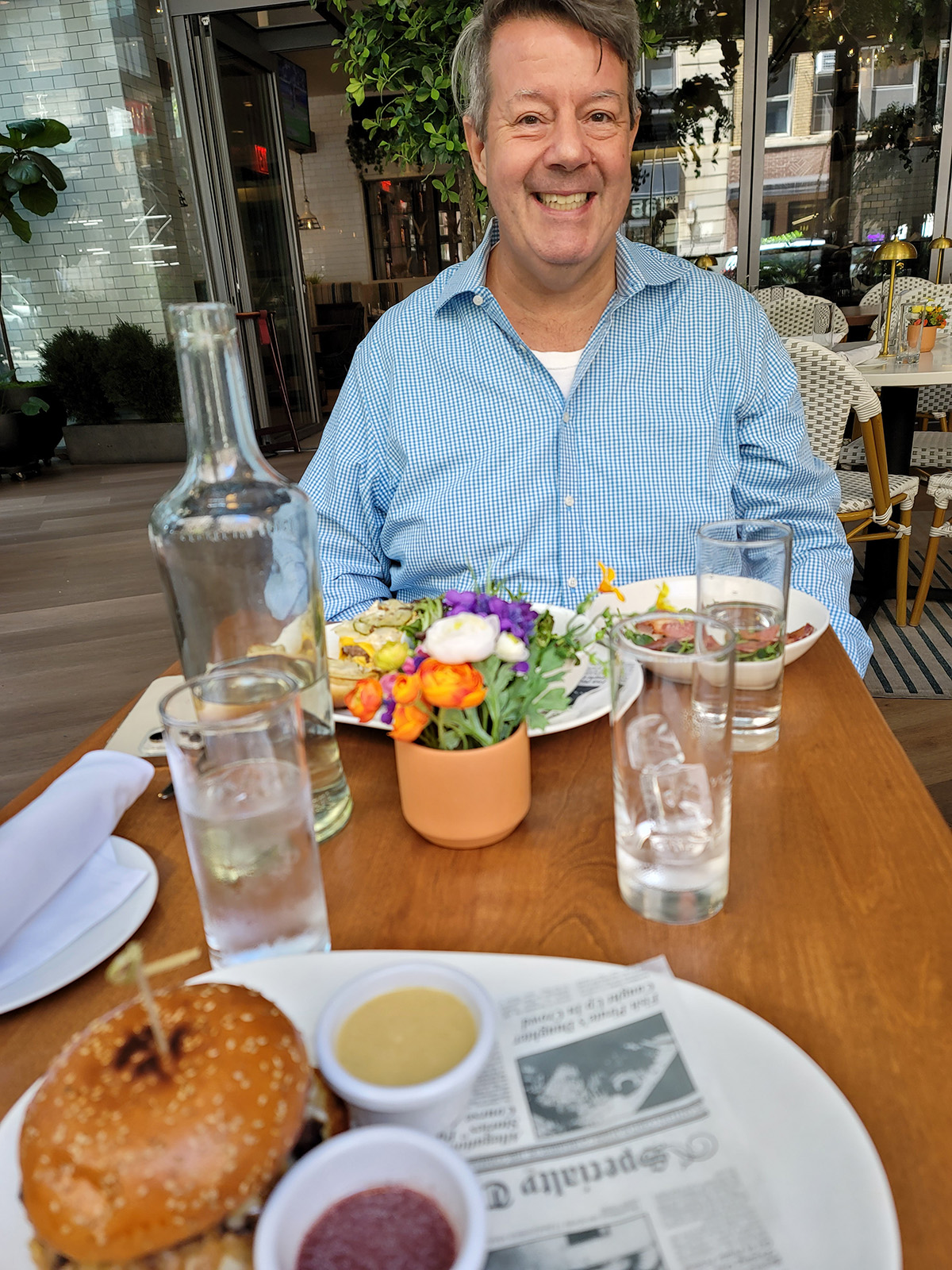 At the Wilson Restaurant with my friend, actor Clell Tickle - also our photographer for today. Our menu included burgers with caramelized onions and salad. They even threw in a free slice of cheese cake.