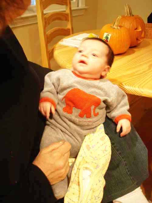 Meet my Grandson Noah on Halloween 2005 when he was one month old. The pic shows Noah looking up at me with a weird expression on his face. For some reason a pumpkin was superimposed over my head. "Grandma, what weird eyes you have! You look like an alien".