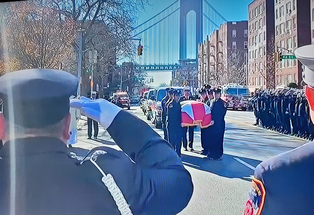 Later, as I walked down 4th Avenue where I live - my building seen on the far left closest to the Verrazano Bridge - I felt proud to be amongst the dozens of New York City fire fighters and others who came to honor my neighbor - retired FDNY deputy chief James Riches, 74, who died on Thanksgiving Day from a 9/11-related illness. Riches spent six months at ground zero digging through the rubble to find the body of his son, Jimmy, who was also a firefighter and died while responding to the attacks. Read the story.