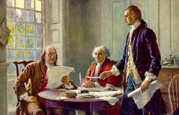 Benjamin Franklin, John Adams, Thomas Jefferson draft the Declaration of Independence in 1776.
