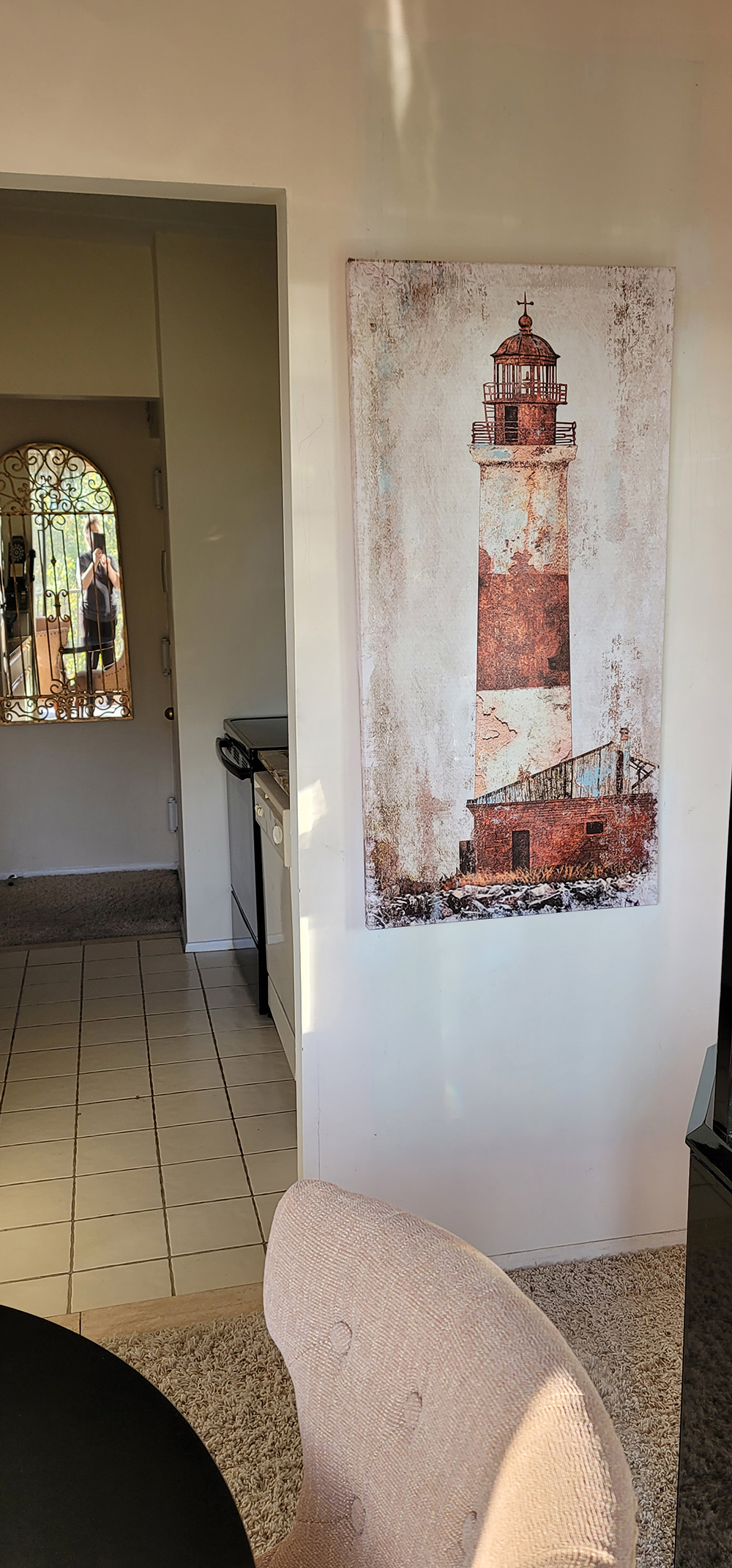 That's a mirror and a reflection of me taking the pic of the lighthouse. Behind me are full length sliding glass door that lead to the terrace facing the park and Verrazano Bridge. My apartment is mostly 'open' with 3 skylights, large windows, sliding glass doors, and lots of mirrors in different designs.