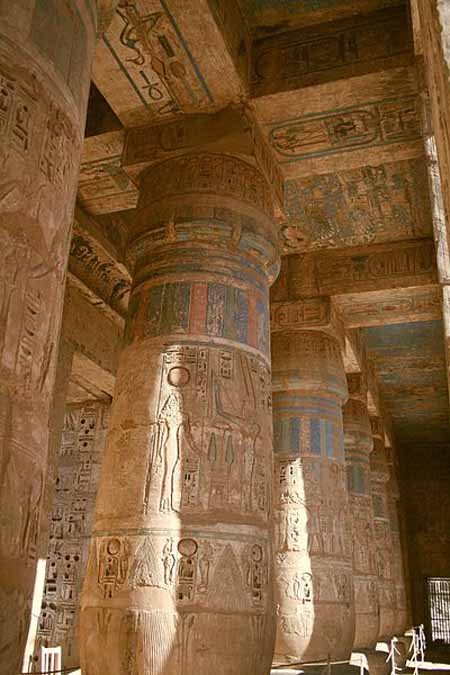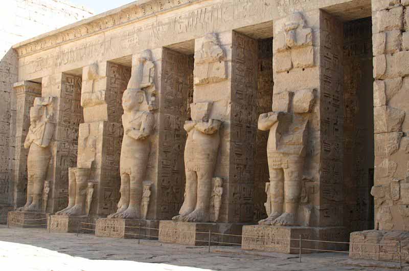 The first pylon leads into an open courtyard, lined with colossal statues of Ramesses III as Osiris on one side, and uncarved columns on the other. The second pylon leads into a peristyle hall, again featuring columns in the shape of Ramesses. This leads up a ramp that leads (through a columned portico) to the third pylon and then into the large hypostyle hall (which has lost its roof). Reliefs and actual heads of foreign captives were also found placed within the temple perhaps in an attempt to symbolize the king's control over Syria and Nubia.