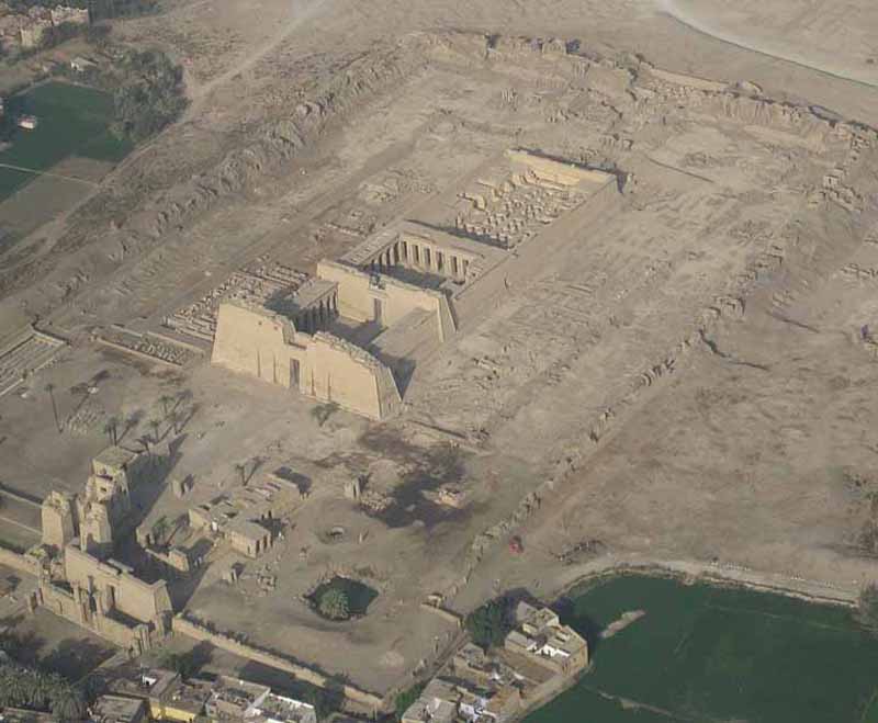 The temple, some 150 m long, is of orthodox design, and resembles closely the nearby mortuary temple of Ramesses II (the Ramesseum). The temple precinct measures approximately 700 ft (210 m). by 1,000 ft (300 m) and contains more than 75,350 sq ft (7,000 m2) of decorated wall reliefs.[1] Its walls are relatively well preserved and it is surrounded by a massive mudbrick enclosure, which may have been fortified. The original entrance is through a fortified gate-house, known as a migdol (a common architectural feature of Asiatic fortresses of the time).