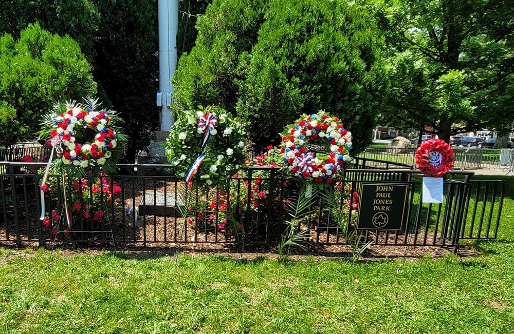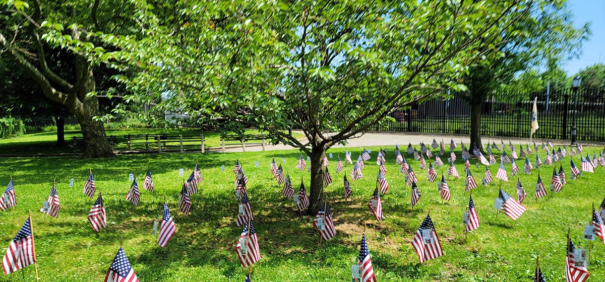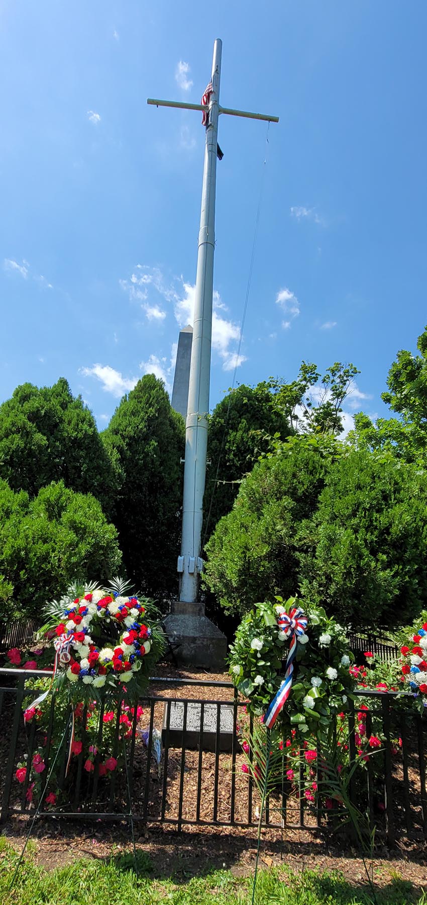 Wreaths, flags, the obelisk, and new plaques representing different wars