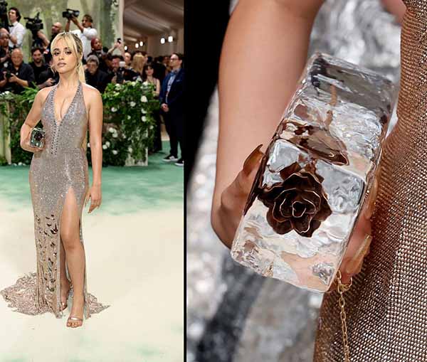 Singer Camilla Cabello wore a strategically shredded chain-mail mermaid dress paired with a purse reminiscent of a block of ice with a bronze-hued 'rose' seemingly frozen within.