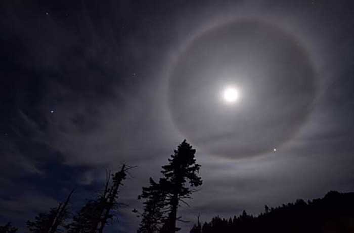 Moon dogs appear as part of the 22° halo, roughly 10 Moon diameters outside the Moon. They are exactly analogous to sun dogs, but are rarer because the Moon must be bright, about quarter moon or more, for the moon dogs to be observed. Moon dogs show little color to the unaided human eye because their light is not bright enough to activate the cone cells.