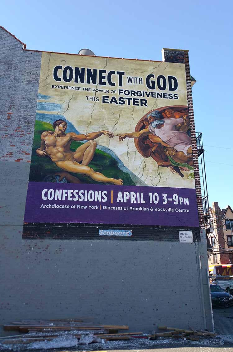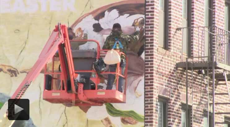 Artists paint iconic Michelangelo image on Brooklyn building for Easter