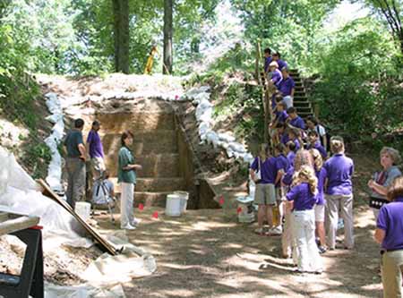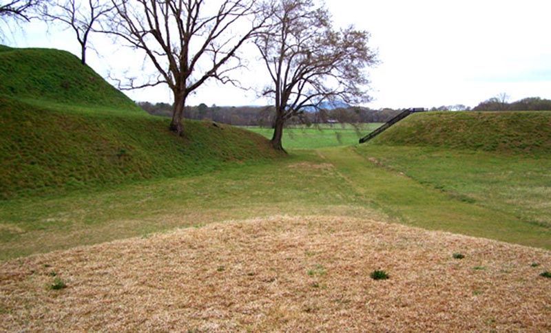 When visiting the Etowah Mounds, guests can view the "borrow pits" (which archaeologists at one time thought were moats) which were dug out to create the three large mounds in the center of the park.
