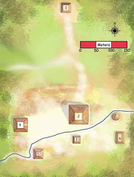 Of the two largest mounds in the group, Mound A occupies a central position in the great plaza, and Mound B lies just to the north, a steep, 58 feet (18 m) tall pyramidal mound with two access ramps; it rises to a height of 58 feet. Along with both mounds, archaeologists have also found evidence of borrow pits, other public buildings, and a dozen small houses constructed of pole and thatch.