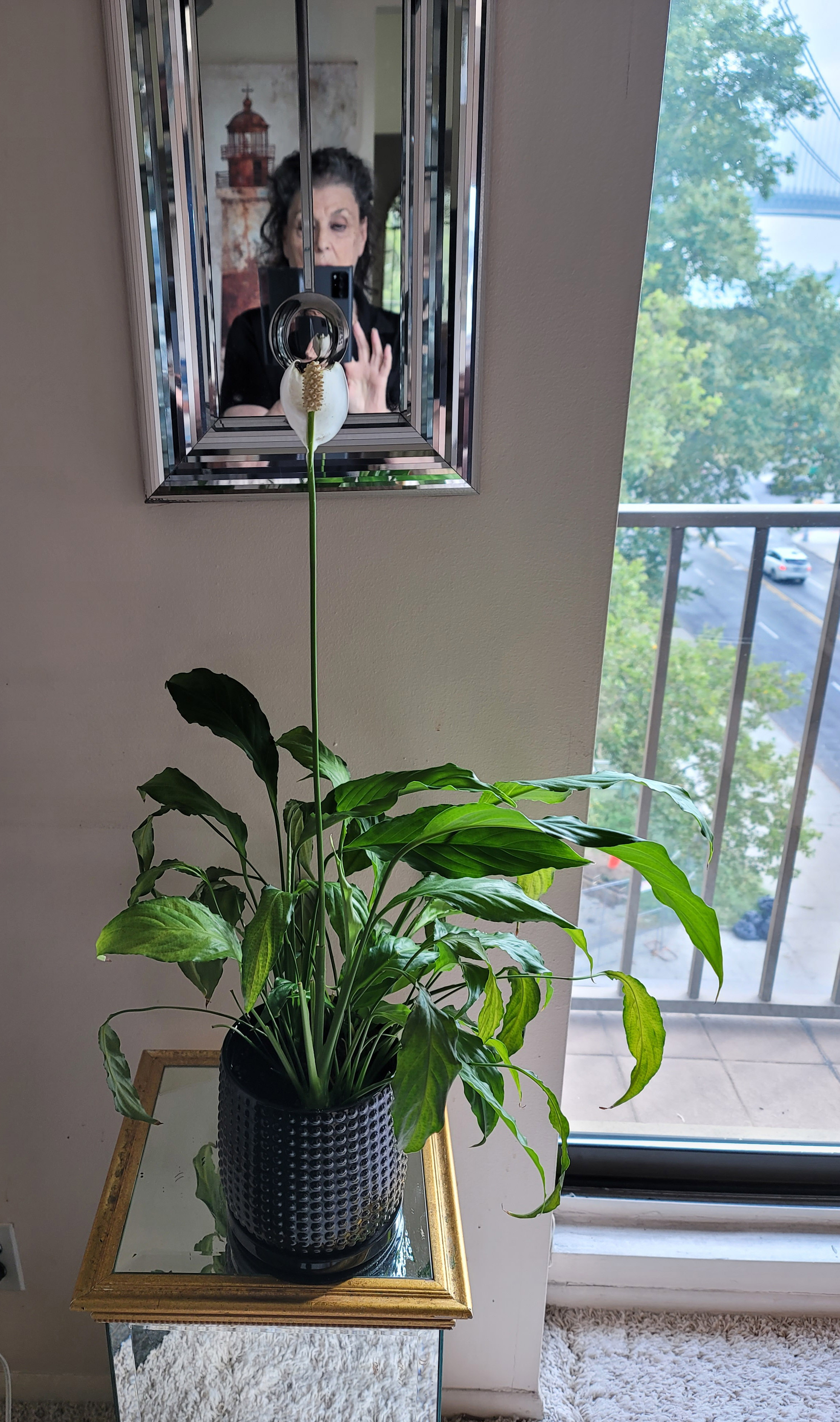 Months ago I rescued a small plant someone had discarded in my building. As the months passed the plant grew big enough to transplant into a larger flower pot. One day I noticed one of the stems shot up and was growing a flower. After the flower bloomed, I took a picture of it, and searched for its name. It's called a peace lily. What's interesting is the top of this peace lily is broken off. Is that a message about peace?