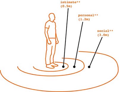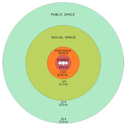 The smallest zone, called "intimate space," extends outward from our bodies 18 inches in every direction, and only family, pets and one's closest friends may enter. A mere acquaintance hanging out in our intimate space gives us the heebie-jeebies. Next in size is the bubble Hall called "personal space," extending from 1.5 feet to 4 feet away. Friends and acquaintances can comfortably occupy this zone, especially during informal conversations, but strangers are strictly forbidden. Extending from 4 to 12 feet away from us is social space, in which people feel comfortable conducting routine social interactions with new acquaintances or total strangers. Beyond that is public space, open to all.