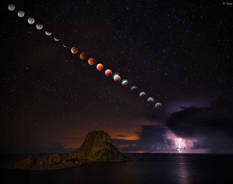 NASA - September 29, 2015What's more rare than a supermoon total lunar eclipse? How about a supermoon total lunar eclipse over a lightning storm. Such an electrifying sequence was captured yesterday from Ibiza, an island in southeastern Spain. After planning the location for beauty, and the timing to capture the entire eclipse sequence, the only thing that had to cooperate for this astrophotographer to capture a memorable eclipse sequence was the weather. What looked to be a bother on the horizon, though, turned out to be a blessing. The composite picture features over 200 digitally combined images from the same location over the course of a night. The full moon is seen setting as it faded to red in Earth's shadow and then returned to normal. The fortuitous lightning is seen reflected in the Mediterranean to the right of the 400-meter tall rocky island of Es Vedra. Although the next total eclipse of a large and bright supermoon will occur in 2033, the next total eclipse of any full moon will occur in January 2018 and be best visible from eastern Asia and Australia.