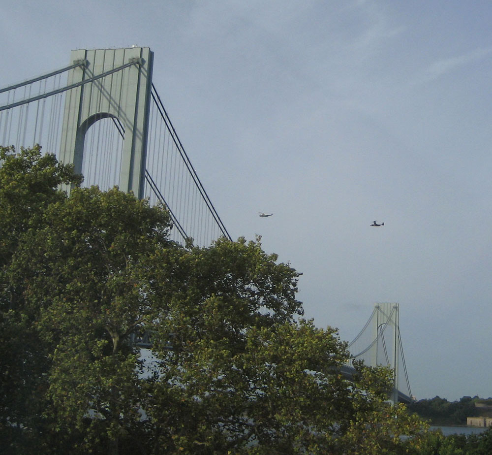 The helicopter the Osprey - half-plane half-helicopter - carrying the Pope - just flew over the Verrazano Bridge on its way to JFK Airport. CNN reports the pope is taking an aerial tour of the city. His helicopter was accompanied by several helicopters with white tops. I quickly captured this picture. The 78 year old pope looks tired but he'll keep the energies going this weekend on the last "leg" of his journey (he has sciatica) guided by his mission. His final stop is Philadelphia. Schedule
