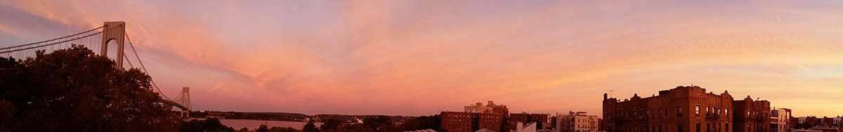 Panorama of a spectacular pink sunrise spanning across the sky to Manhattan where we greet the pope today.