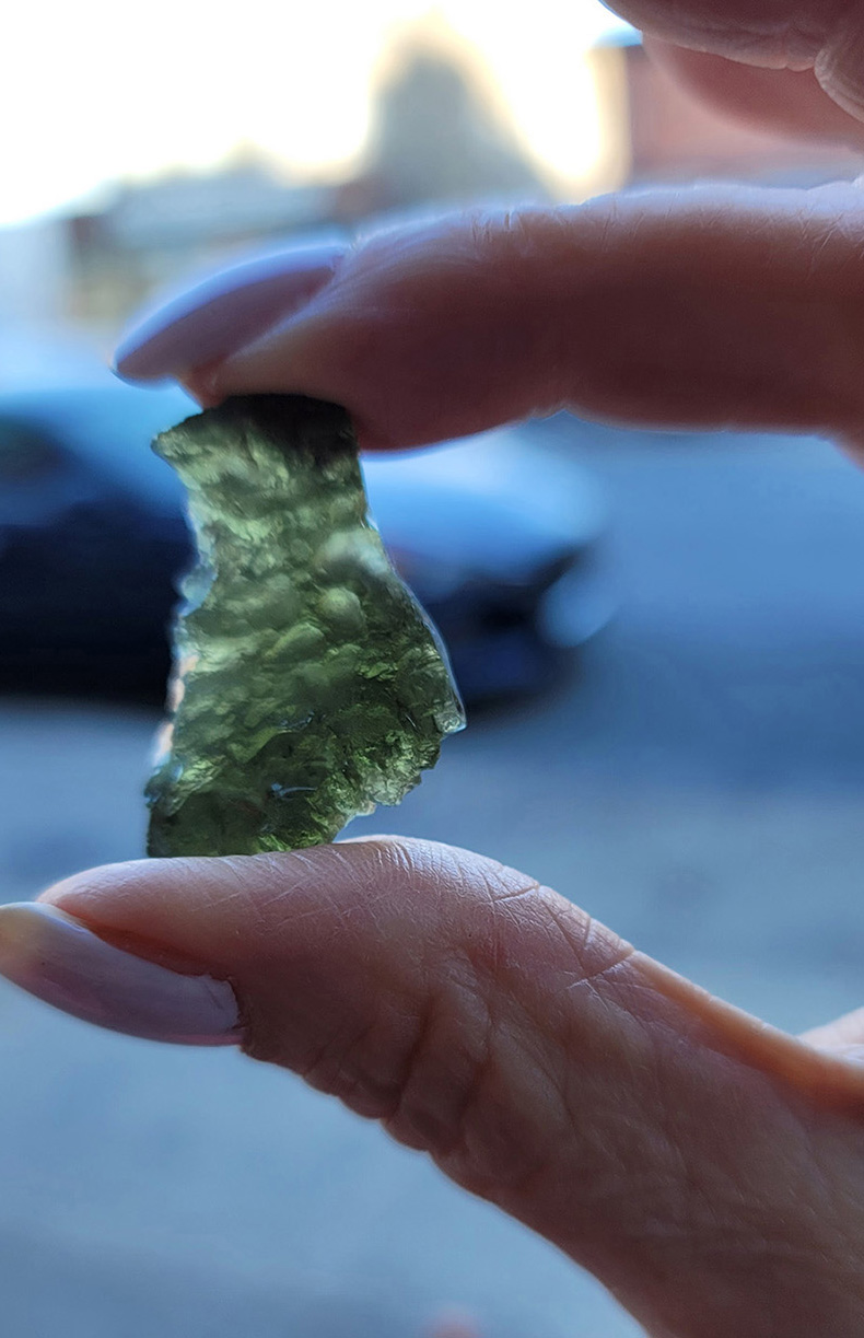 Saturday night I took this pic holding a small piece of moldavite a client asked me for - a crystal many people connect with though it does nothing for me. I think it looks like green glass. I bought it at a UFO conference back in the days when I attended such events and met people who were ... shall we say "colorful" and waiting for their "ship" to come in. At that time I was told moldavite has an alien connection.