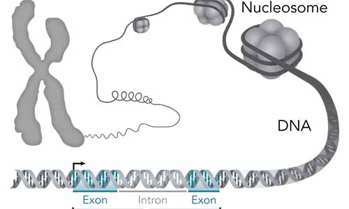 Stylistic diagram shows a gene in relation to the double helix structure of DNA and to a chromosome (right). The chromosome is X-shaped because it is dividing. Introns are regions often found in eukaryote genes that are removed in the splicing process (after the DNA is transcribed into RNA): Only the exons encode the protein. The diagram labels a region of only 55 or so bases as a gene. In reality, most genes are hundreds of times longer.