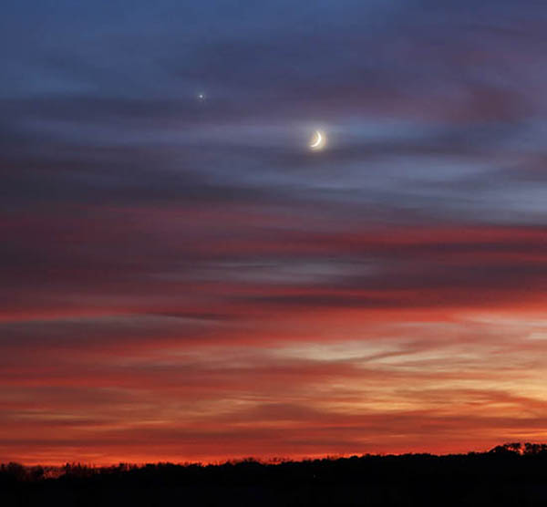 Next month's conjunction will be even better because the crescent Moon will be even closer to Venus, only a fraction of a degree away, and Venus will be a crescent, too! Like the Moon, Venus has phases, and during next month's conjunction the second planet will be only 23% illuminated. Wide-field telescopic images will reveal two crescents side by side. ~ Spaceweather.com