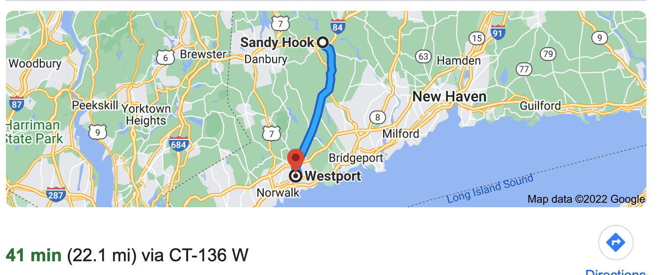 22 miles away in Westport, CT. two of my grandsons, Noah and Matthew, were in their elementary school when the incident occurred - their school quickly locked down as my daughter and her husband waited for word with other anxious parents in CT.