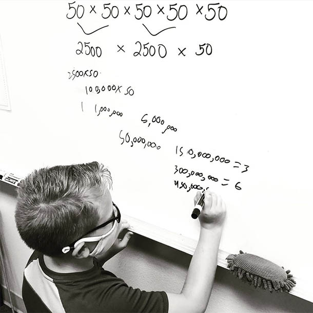 "So nice being back in the classroom with my gifted mathematicians. I could watch them work all day. This little boy asked me what 50 to the fifth power would equal, so I set it up, sat back, and observed his problem-solving strategies. My students and I plan to enjoy every minute together that presents."
