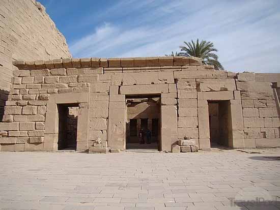 Seti II also expanded the copper mining at Timna in Edom, building an important temple to Hathor the cow goddess in the region. Abandoned in the late Bronze Age collapse, where a part of the temple seems to have been used by Midianite nomads, linked to the worship of a bronze serpent discovered in the area. Seti II also founded a station for a barge on the courtyard in front of the pylon II at Karnak, and chapels of Theban triad - Amun, Mut and Khonsu.