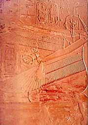 The remainder of this corridor continues with sections of the Litany of Re, including the 75 forms of the sun god. Further on, we also find the second and third hours of the Amduat on both the east and west walls. In this corridor, the ceiling once again portrays Isis and Nephthys, this time as kites, on either side of a sun disk containing the ram headed bird representing the ba (soul) of Re. This scene is followed by more text from the Litany of Re. Stars were to have filled the remainder of the ceiling, but were never completely rendered.