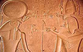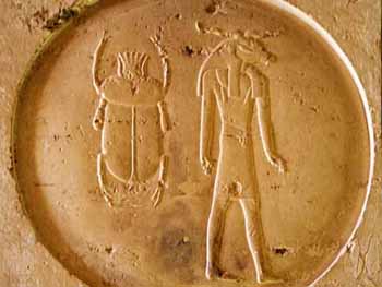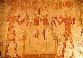 However, in the next, longer corridor (Corridor One) on the doorway lintel is depicted the kneeling goddesses Isis and Nephthys, and between them a sun disk with a scarab and a ram headed god. Inscribed on the jambs of the doorway are the names of Seti II with an image of Ma'at, also shown kneeling. Within this corridor, are depictions of Seti II making offerings to Re-Horakhty and offering vases to Nefertem followed by the initial passages of the Litany of Re on the east wall. The scene of Seti II and Nefertem were cut over the original opening vignette of the Litany of Ray which was then inscribed further down the corridor. On the west wall are scenes of Sokar and Seti II making offerings of incense and libations to Re-Horakhty.