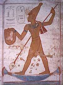 Over the outer lintel of the second corridor is found a winged disk, while on the doorjambs the Litany of Re is continued. On the walls within this corridor, the decorative theme is executed in red, preliminary sketches only. On the east wall we find Seti II making offerings to Re-Horakhty, while on the west wall he makes an offering to Sokar.